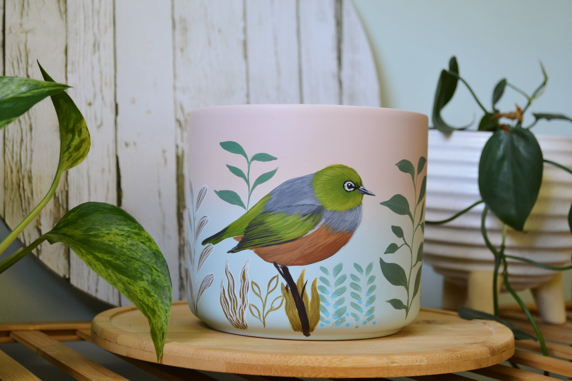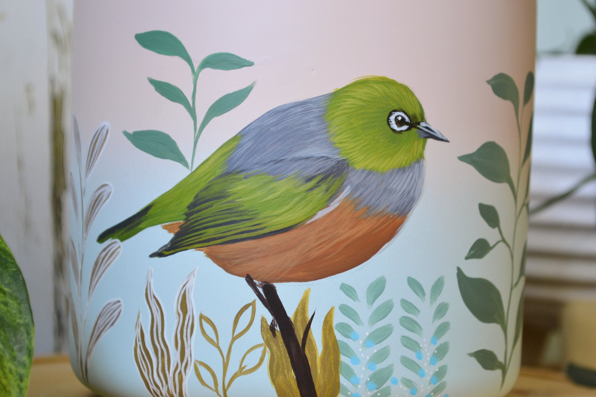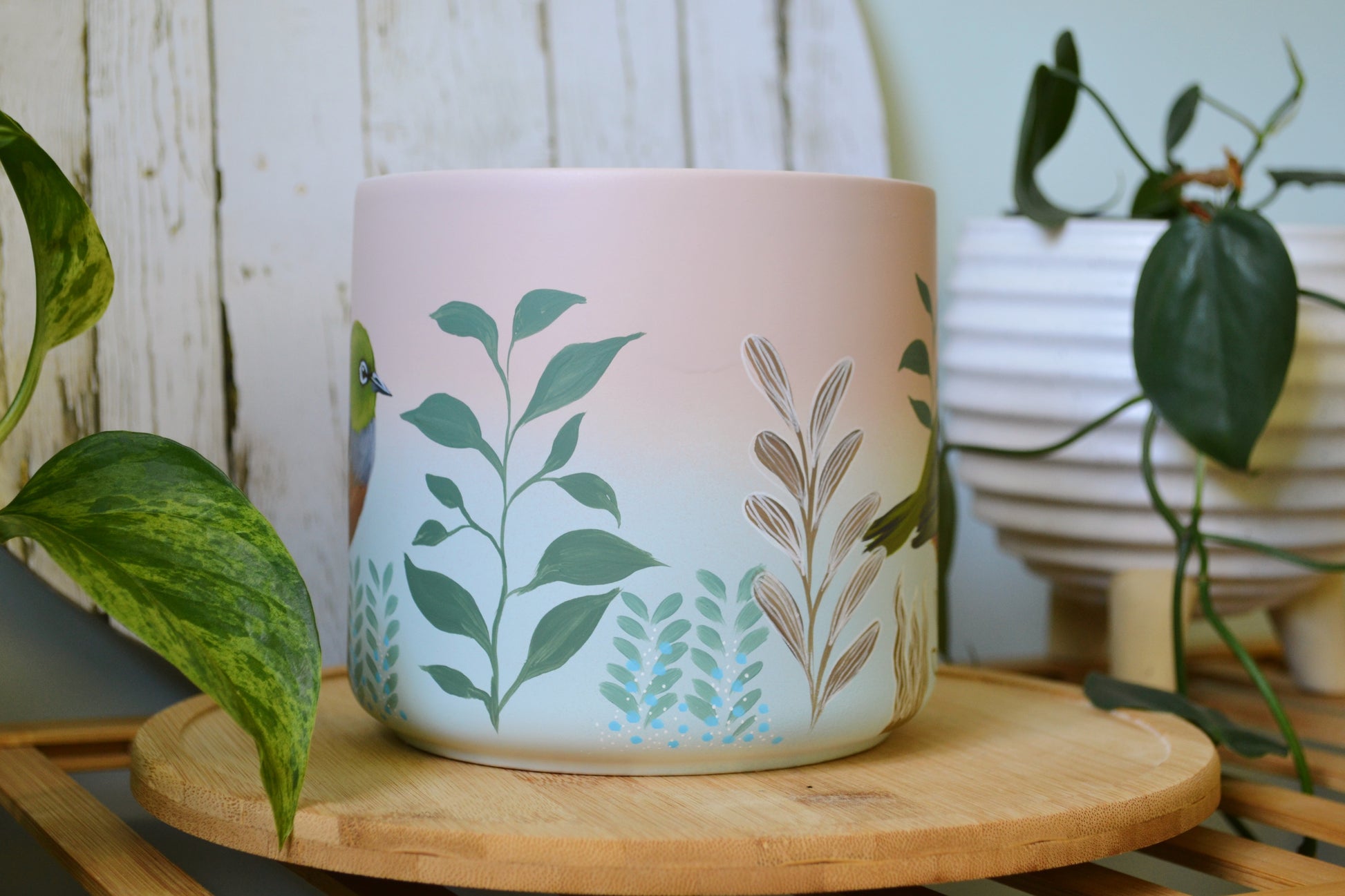 Available in 14cm, 18cm, 20cm, 23cm. Hand painted terracotta pots with UV protectant clear coat. 20cm and 23cm pots have drainage holes.