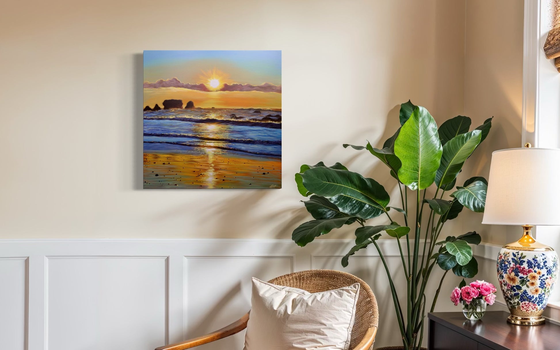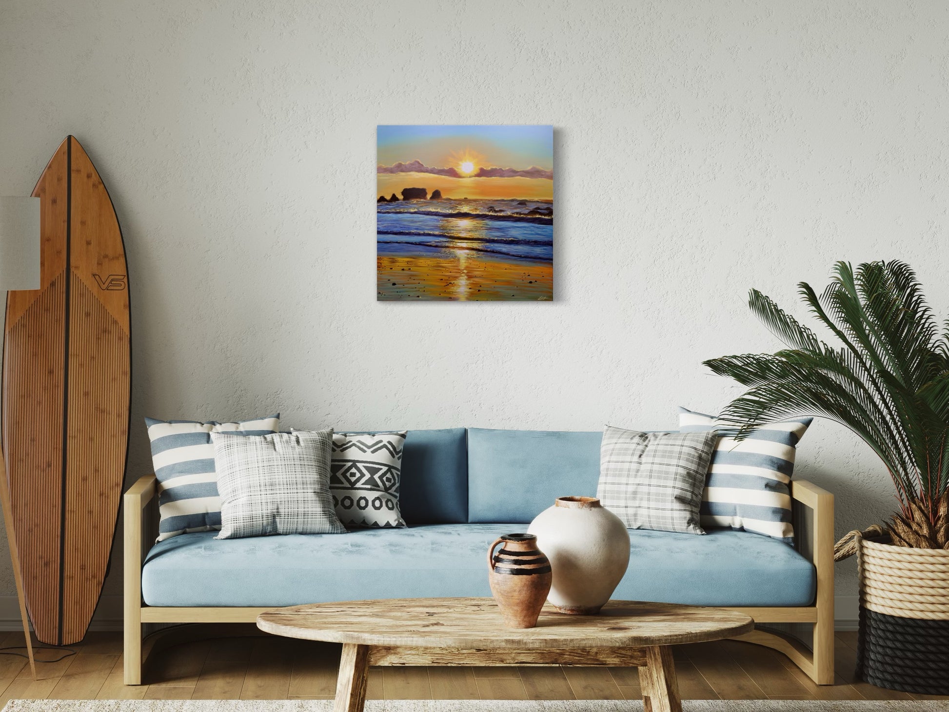 The Great Coast Road is well known for its great views. Its also the best view for sunsets. The way the sun touches and shimmers on the waves create ember like elements touching the water. It truly is a mesmerising view. An eye catching piece that would be a perfect addition to your interior.