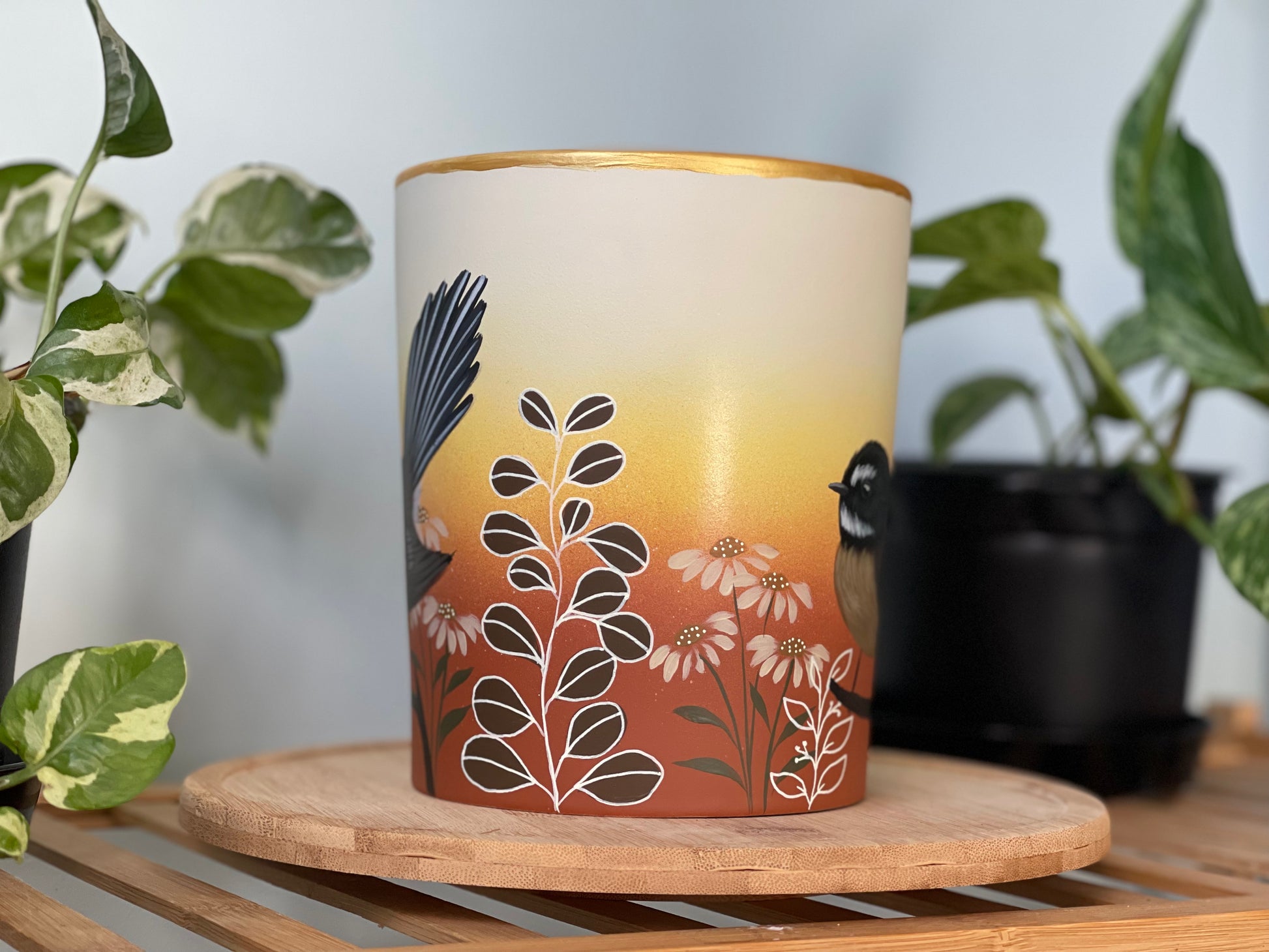 Available in 14cm, 18cm, 20cm, 23cm. Hand painted terracotta pots with UV protectant clear coat. 20cm and 23cm pots have drainage holes.