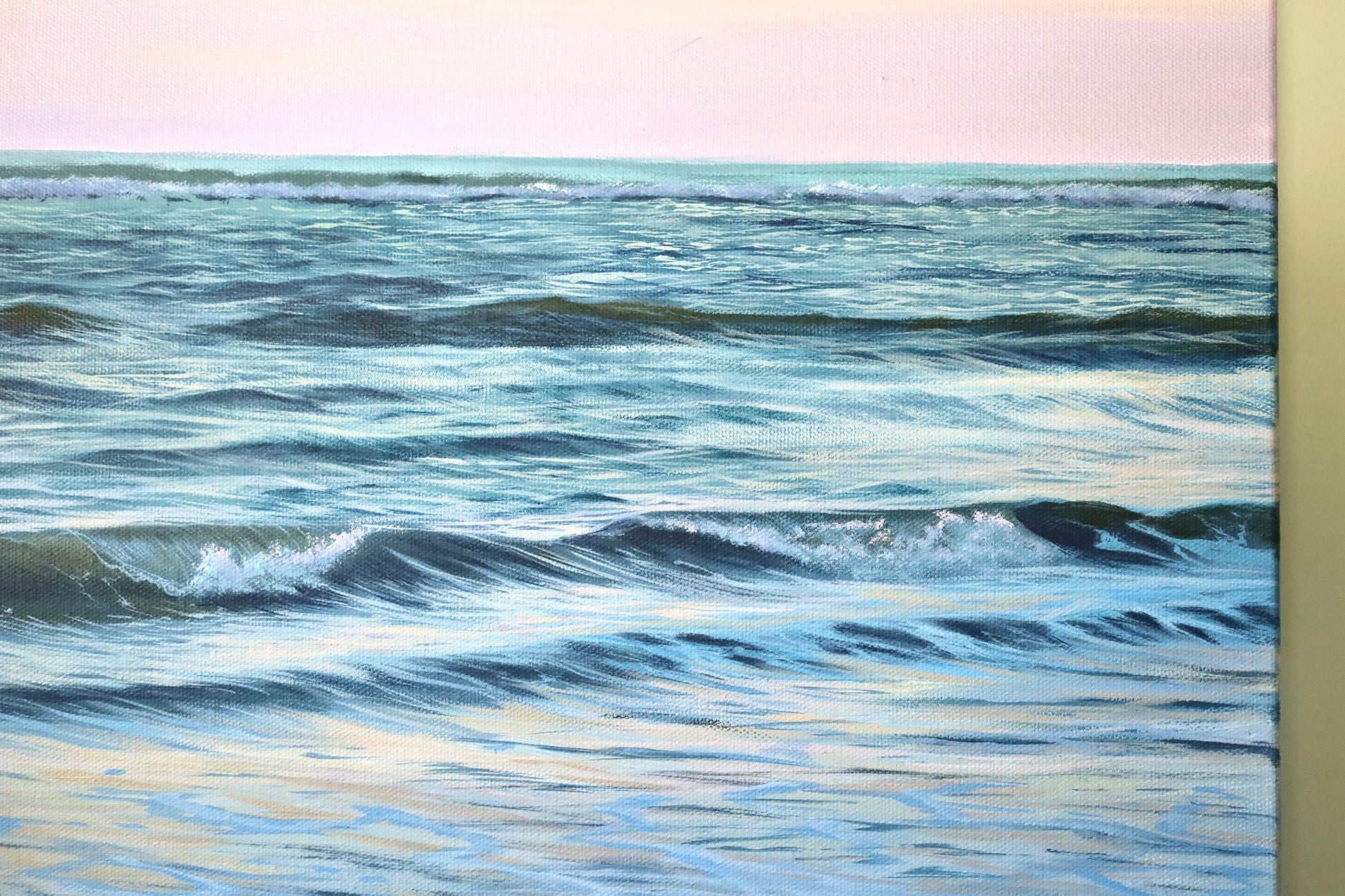 This painting called “Renewed Serenity” is fresh from the easel. A scene that is captured post sunset on a beautiful beach off the West Coast of New Zealand. This painting is created from my love of painting water and the beauty of the colour of nature and its changes.